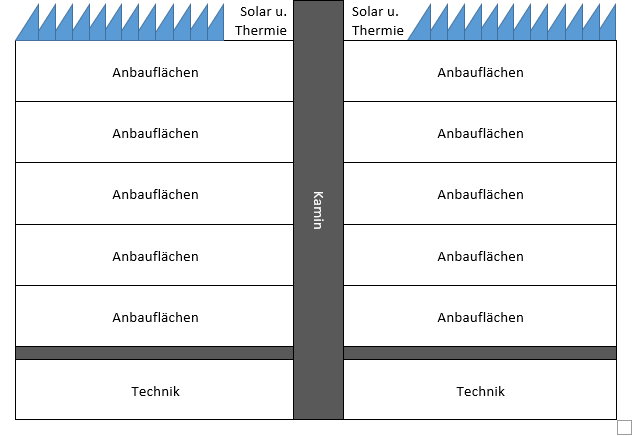 Der Kamineffekt könnte mit dem warmen Wasser vom Dach reguliert werden und es könnten damit verschiedene Wärmezonen auf den Anbauflächen realisiert werden. Demzufolge müssten auch Pumpen installiert werden.