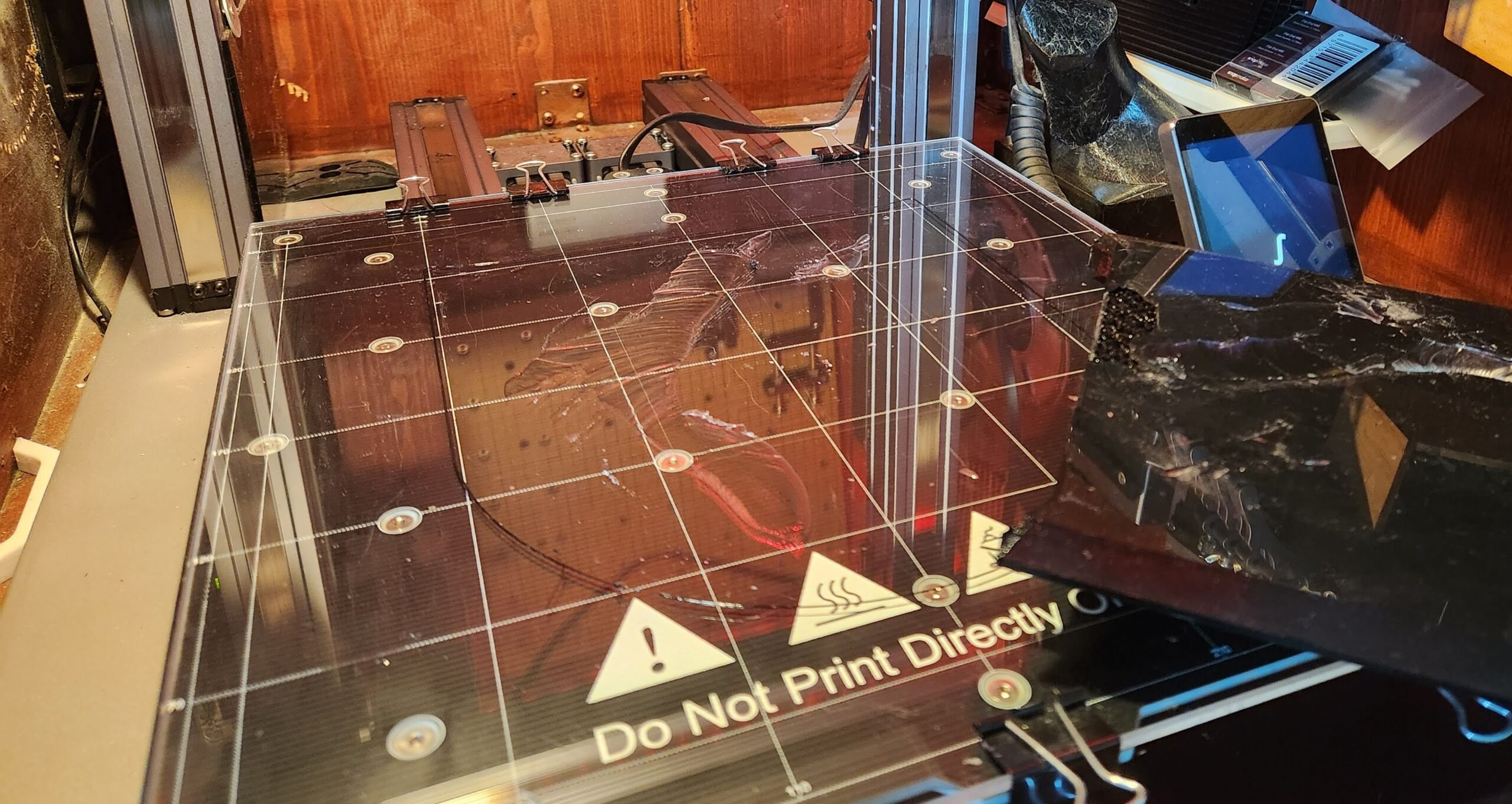 Druck man auf einer Glasplatte, kann man diese nicht einfach knicken um das Druckgut von der Platte zu lösen. Also besorgt man sich Heber und Spachtel, um die Drucke entsprechend zu lösen. Hat man etwas Zeit, muss man nicht viel unternehmen um den Druck von der Platte zu lösen. Ist man ungeduldig und möchte gleich weiter Drucken, kann es unter Umständen dazu kommen, dass man seine Druckplatte zerstört. Ich hätte nicht im Traum daran gedacht, dass ich die Oberfläche des Borosilikatglases durch das Ablösen meines Druckes zerstören könnte. Der letzte Druck war etwas größer und hatte dementsprechend eine große Haftungsoberfläche. Als ich meinen Heber ansetzte knisterte das PETG etwas. Bis hierhin völlig normale Geräusche! Da ich feststellte, dass ich das Druckgut nicht adäquat von der Platte lösen konnte, wartet ich doch noch etwas bis die Platte abgekühlt war.