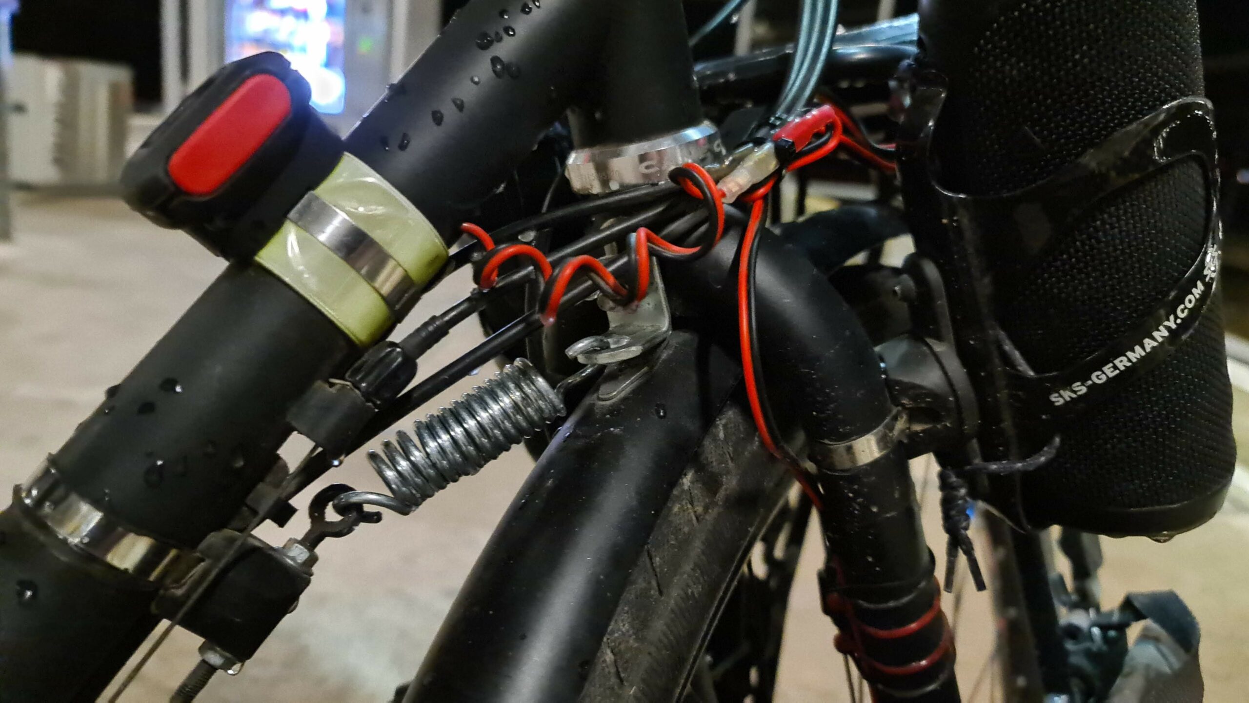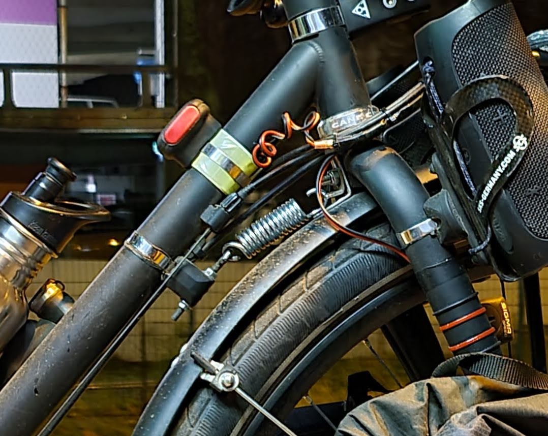 Es gibt Teile am Fahrrad die lernt man erst zu schätzen, wenn man sie nicht mehr hat. Mit der Zeit war der Lenkungsdämpfer etwas ausgeleiert, also tauschte ich die Feder gegen eine stärkere Feder. 2 Wochen lang war dies eine gute Entscheidung, bis der Winkel durch die stärkere Belastung brach. Ohne Lenkungsdämpfer schlägt das vordere Rad stärker ein und das Fahrrad steht nicht so sicher, wenn man die vordere Partie beladen hat. Was ich noch gelernt habe? Da ich die Verkabelung eingerichtet habe, mit verbautem Lenkungsdämpfer, war das Kabel nicht für den kompletten Weg des Lenkers ausgelegt. Was mit Kabeln passiert, welche unter Zug geraten? Das wurde mir dann bewusst, als ich mein Rücklicht reparieren wollte, dass Stück für Stück den Dienst quittiert hatte.