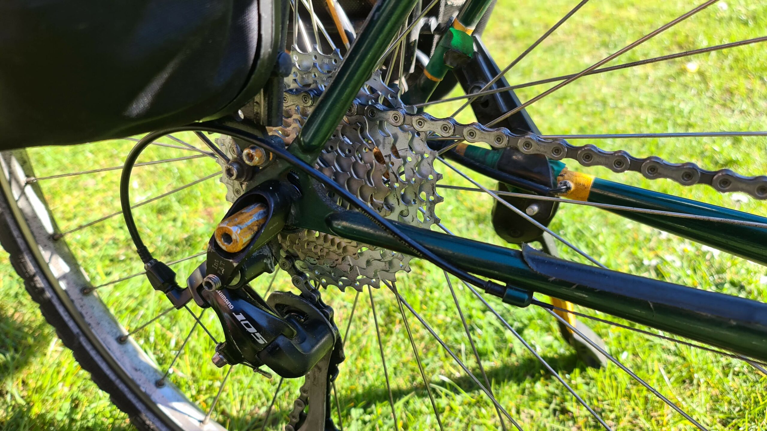Nachdem die Kette montiert war, mussten wir den Umwerfer und das Schaltwerk an die neuen Gegebenheiten anpassen. Ein 36er Kettenblatt auf der Kassette, ist schon eine Nummer und auch die obere Grenze des 105er Schaltwerkes an diesem Rahmen. Die Schraube zur Winkeleinstellung wurde komplett versenkt, damit die Leitrolle nicht mit dem oberen Kettenblatt kollidiert!