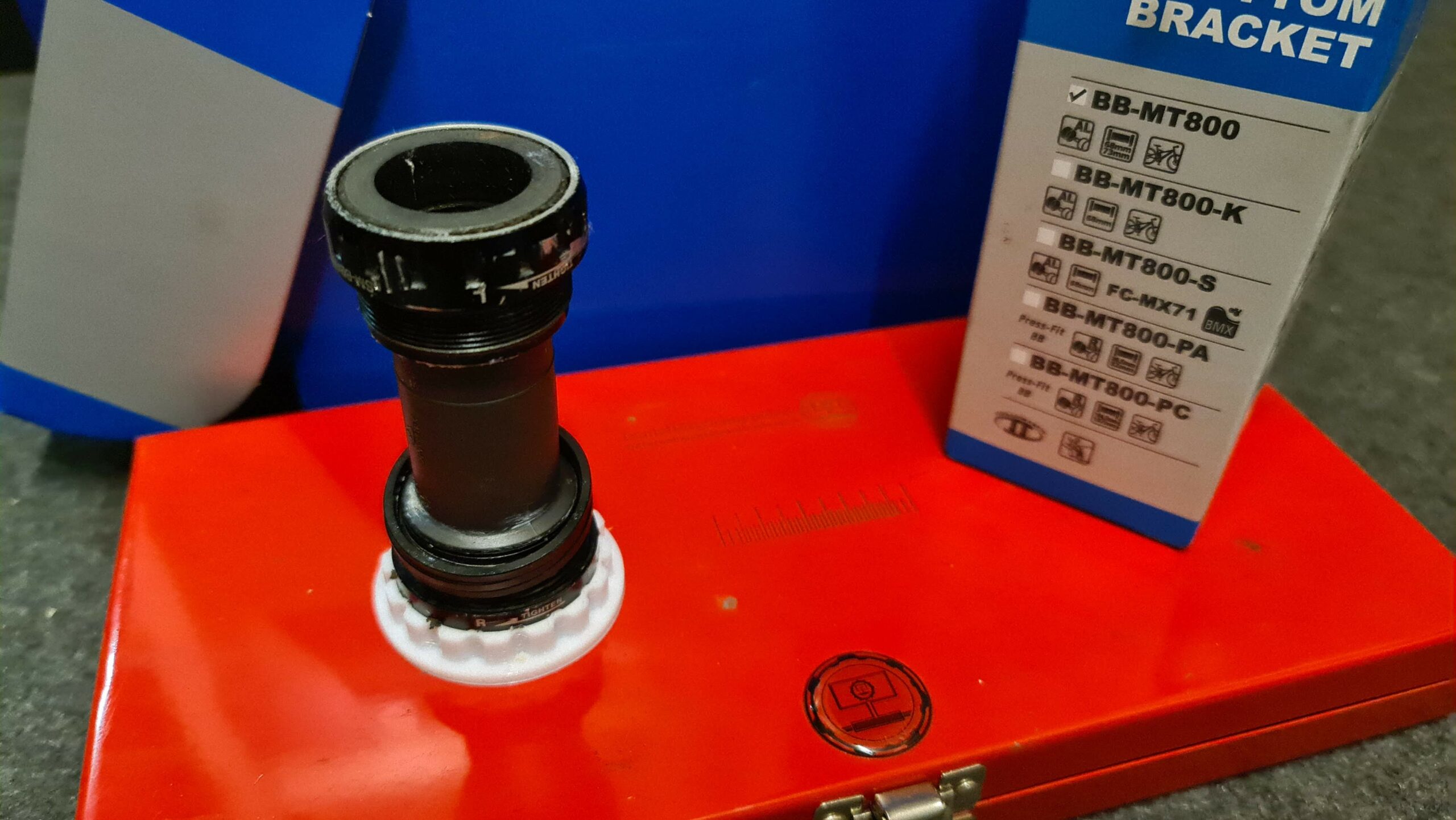 Alles lief seinen gewohnten Gang, bis zu dem Punkt an dem ich mich dem Innenlager zuwenden wollte. Da mein Werkzeug auf größere Innenlagerschalen ausgelegt war, stand ich erstmal ganz schön blöd vor dem Innenlager. Na gut dacht ich mir, dann musst du halt den 3D-Drucker anwerfen und ein passendes Teil drucken. Also machte ich mich erstmal schlau, was für Teile es für Innenlager gab und fand recht schnell Adapterstücken. Der Shimano TL-FC25 ist ein Innenlagerwerkzeug-Adapter, welcher genau passen sollte. Also suchte ich bei Thingiverse nach einem passenden Adapter und wurde auch schnell fündig. In der Zwischenzeit wurde die alte Innenlagerschale mit der Zange entfernt. Erlitt aber trotz eines Tuches schwere Einschläge, da das Teil aus Aluminium ist. Nach dem der Drucker nach ca. 40 Minuten das Teil fertig gedruckt hatte, konnten wir mit der Montage des neuen Lagers beginnen.