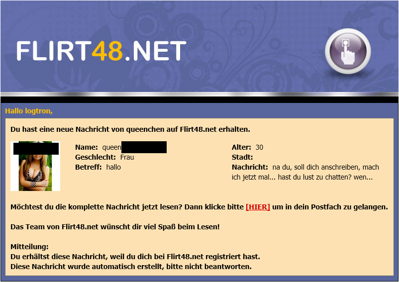 Was soll ich sagen. Selten eine Seite gehabt, die so offensichtlich ihre Benutzer hinter das Licht führt. Um festzustellen, ob eine Seite ihre Benutzer manipuliert, habe ich mehrere Accounts erstellt. Bei Flirt48.net wurde ich innerhalb kürzester Zeit von mehreren Frauen angeschrieben. Nach der kostenlosen Erstanmeldung, verfügt man über ein kleines Kontingent an Mitteilungen. Folglich hätte ich ein paar Euro investieren müssen, um mit diesen Damen weiter im Gespräch zu bleiben. Einige dieser “Betreuer/innen”, drängten mich regelrecht dazu mein Konto aufzuladen. Als ich dann auf den anderen Accounts, die gleichen Mitteilungen bekam. War mir klar, dass hier eher die Interessengemeinschaft Flirt48.net Interesse an mir zeigte. Daraufhin schrieb ich die mir anvertrauten “Damen” gleichzeitig über die unterschiedlichen Accounts an, um eine Reaktion diesbezüglich abzuwarten. Meine Bemerkung, zu den Methoden des Betreibers, wurden wie erwartet ignoriert. Stattdessen bekam ich einen freundlichen Verweis auf die AGBs und einen Hinweis, dass ich gegen diese verstoßen würde. Einige meiner Accounts wurden folglich auch gleich durch Flirt48.net geschlossen und andere blieben erstaunlicher Weise verschont. Fortan wurde ich also von Flirt48.net per Mail benachrichtigt, wenn sich ein/e Mitarbeiter/in meiner annahm.