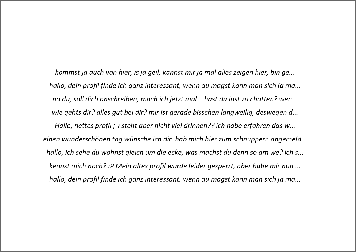 Hat man sich erstmal auf diesen Plattformen angemeldet, entfaltet das eigene Wunschdenken seine volle Kraft. Angelockt durch Meldungen von potentiellen Interessenten, ist man teilweise gerne bereit, mal ein paar Euro zu investieren, um ein kleines Erfolgserlebnis zu erlangen. Man macht ein paar Fotos und stellt diese, zur Bewertung durch das gewünschte Geschlecht, bereit.